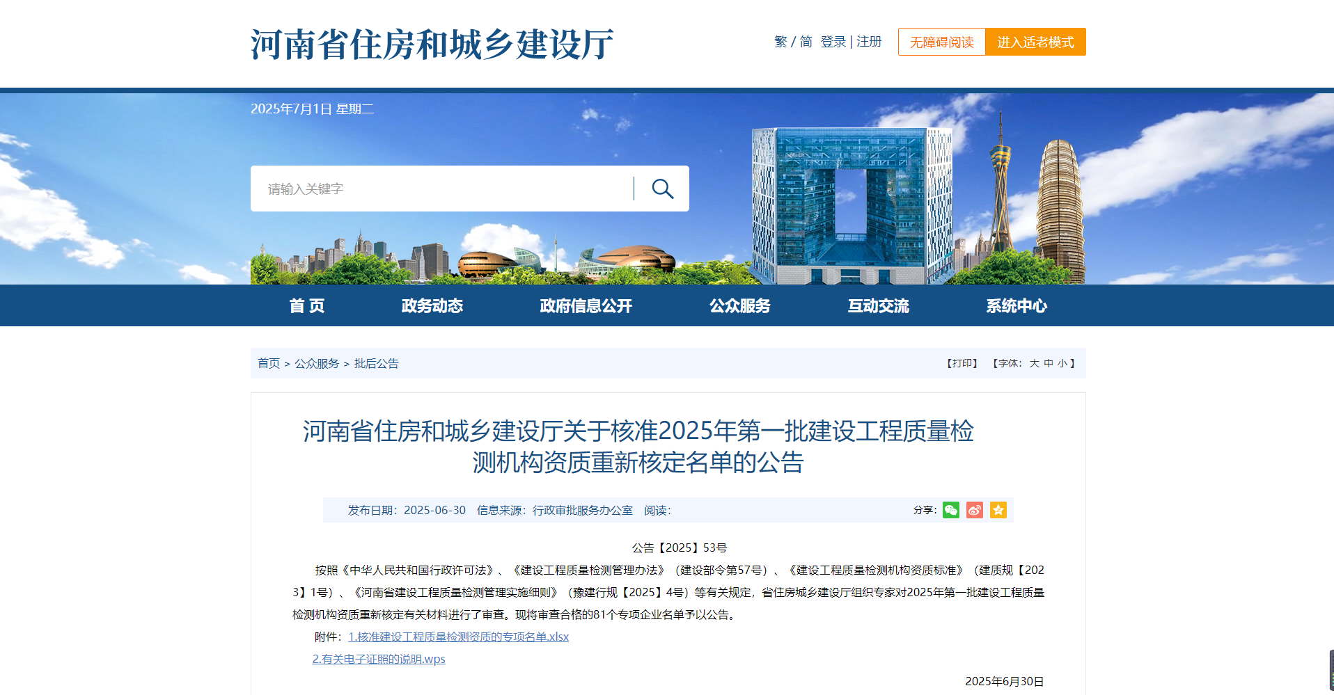 熱烈祝賀我司通過河南省住建廳2025年第一批建設工程質(zhì)量檢測機構資質(zhì)重新核定!!!